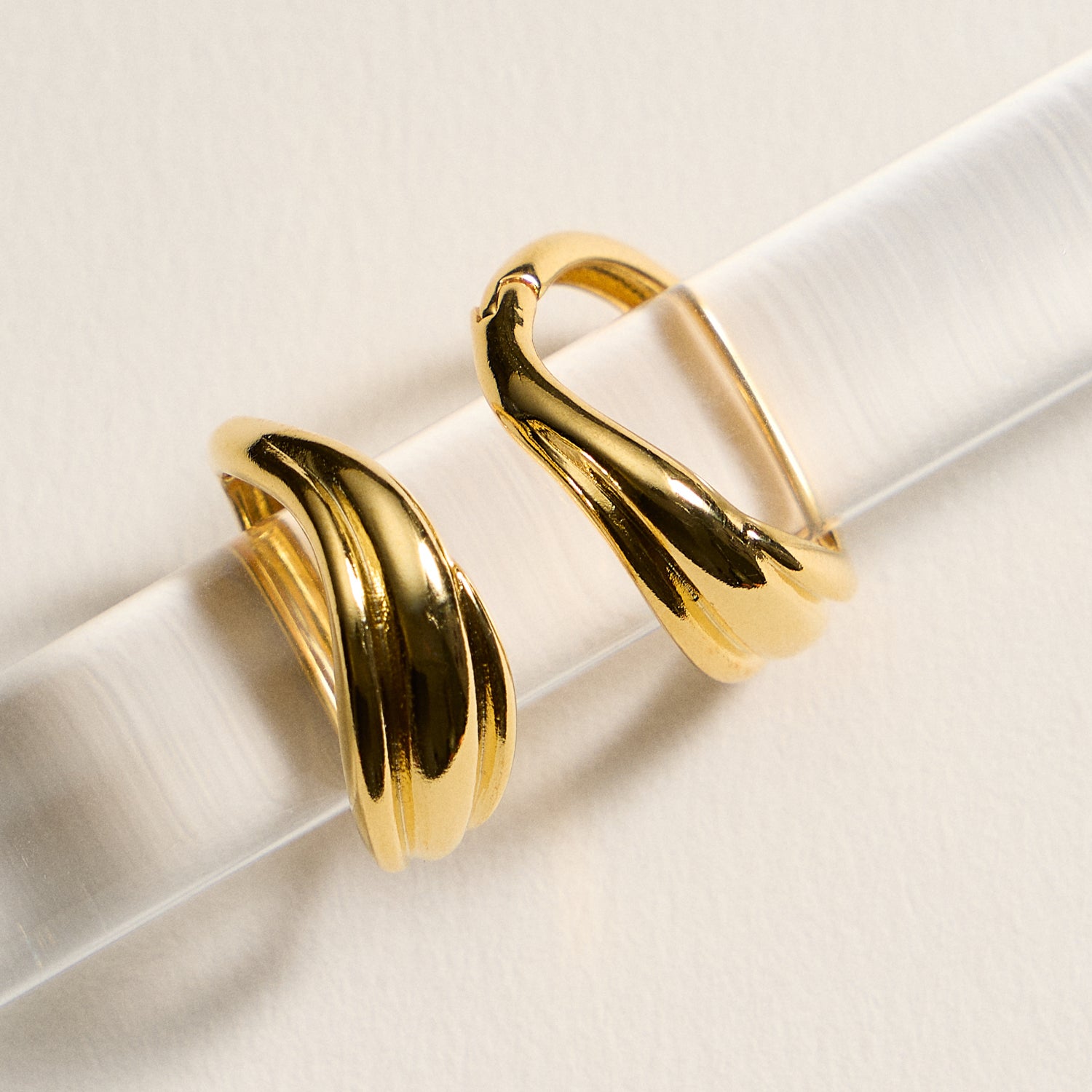 These gold-dipped hoop earrings feature a sleek layered wave design that adds depth and sophistication to any look. Expertly crafted in Korea, their polished finish catches the light beautifully, making them perfect for both everyday wear and special occasions. Lightweight and comfortable, these modern hoops are a versatile accessory that effortlessly complements casual and dressy outfits alike.