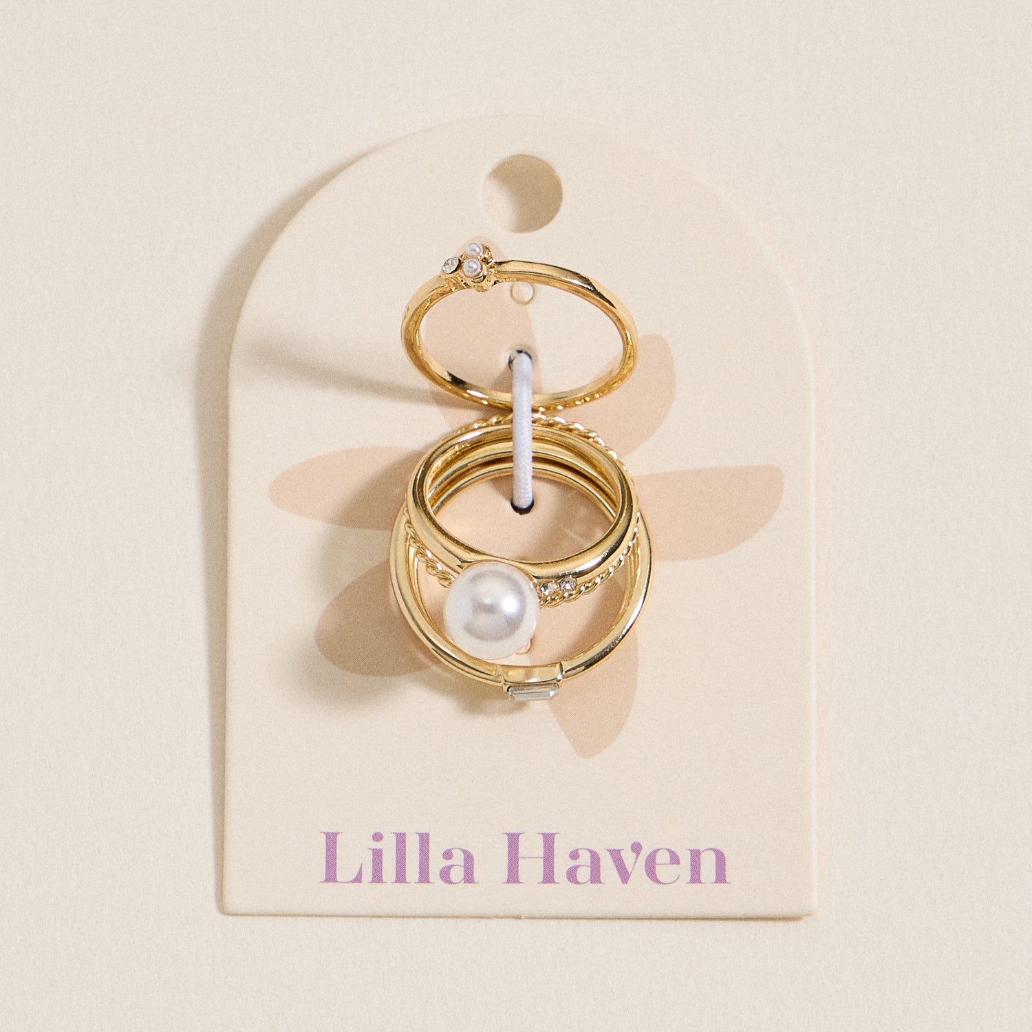 This elegant 5-piece gold ring set features a mix of textures and accents, including a statement faux pearl, delicate crystal details, and a twisted band. Designed for effortless stacking or standout solo wear, each ring brings a refined touch to any jewelry collection. Perfect for boutique owners looking to offer versatile and feminine accessories with a modern finish.