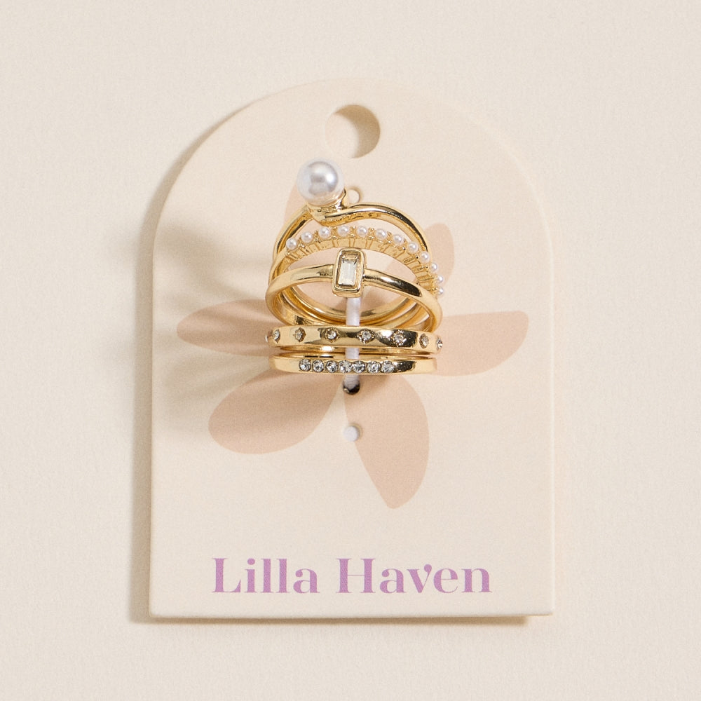 This elegant 5 piece gold ring set features a mix of freshwater pearl, baguette, and round crystal details for a refined yet versatile look. Each ring offers a unique design that can be worn stacked or separately for multiple styling options. Perfect for gift giving or adding everyday luxury to your jewelry assortment. Nickel free and designed for comfort, this set is a customer favorite for boutiques seeking timeless style with a modern twist.