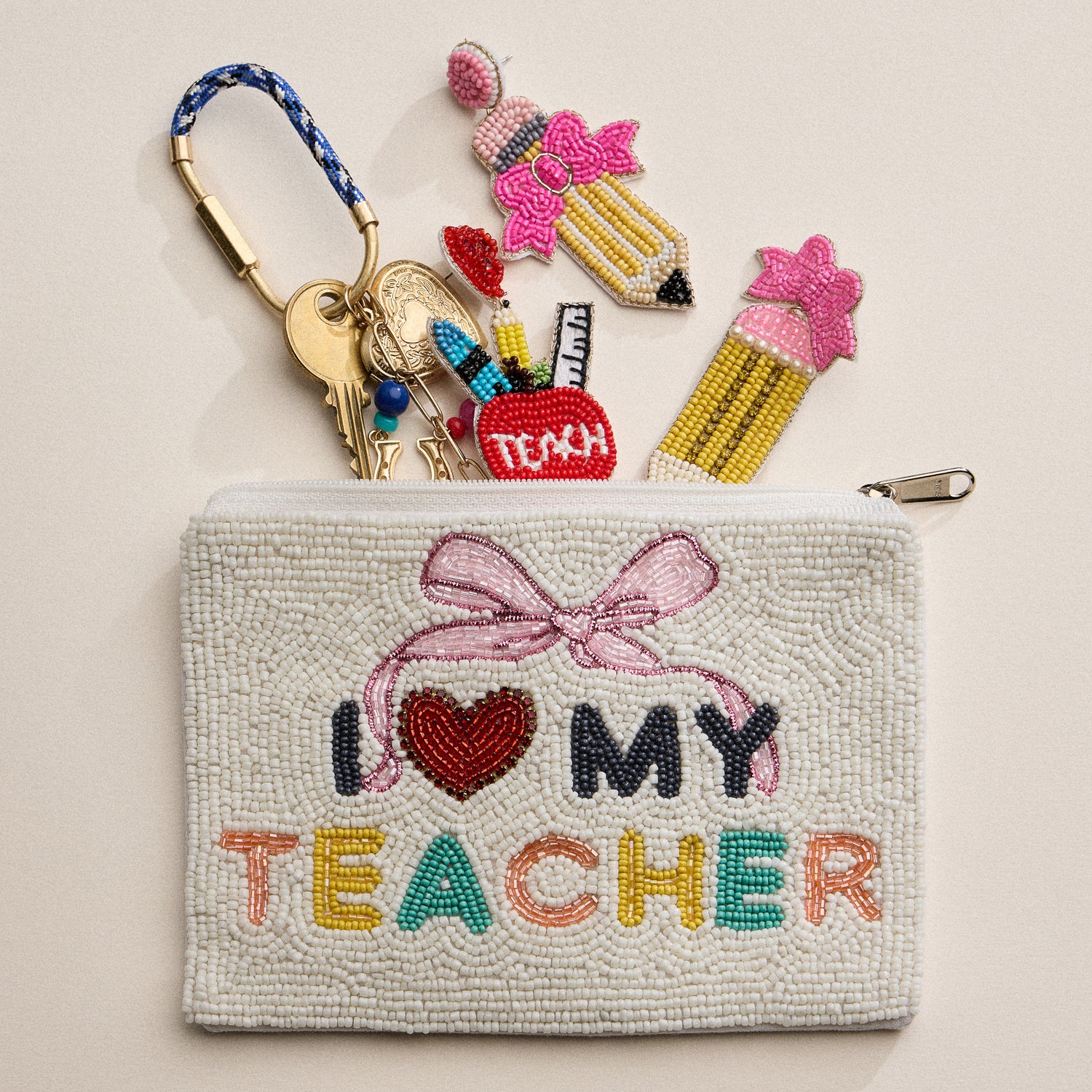 Celebrate your favorite educator with this charming beaded I Love My Teacher pouch. Featuring colorful hand-beaded letters, a sweet pink bow, and heart design, this pouch makes the perfect teacher gift or back-to-school accessory. Ideal for storing pens, keys, or small essentials with style.