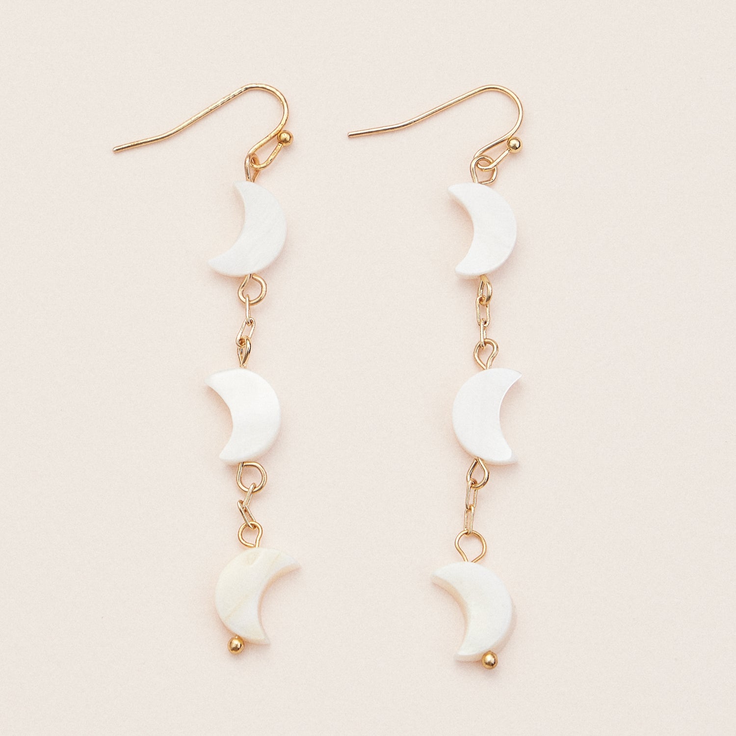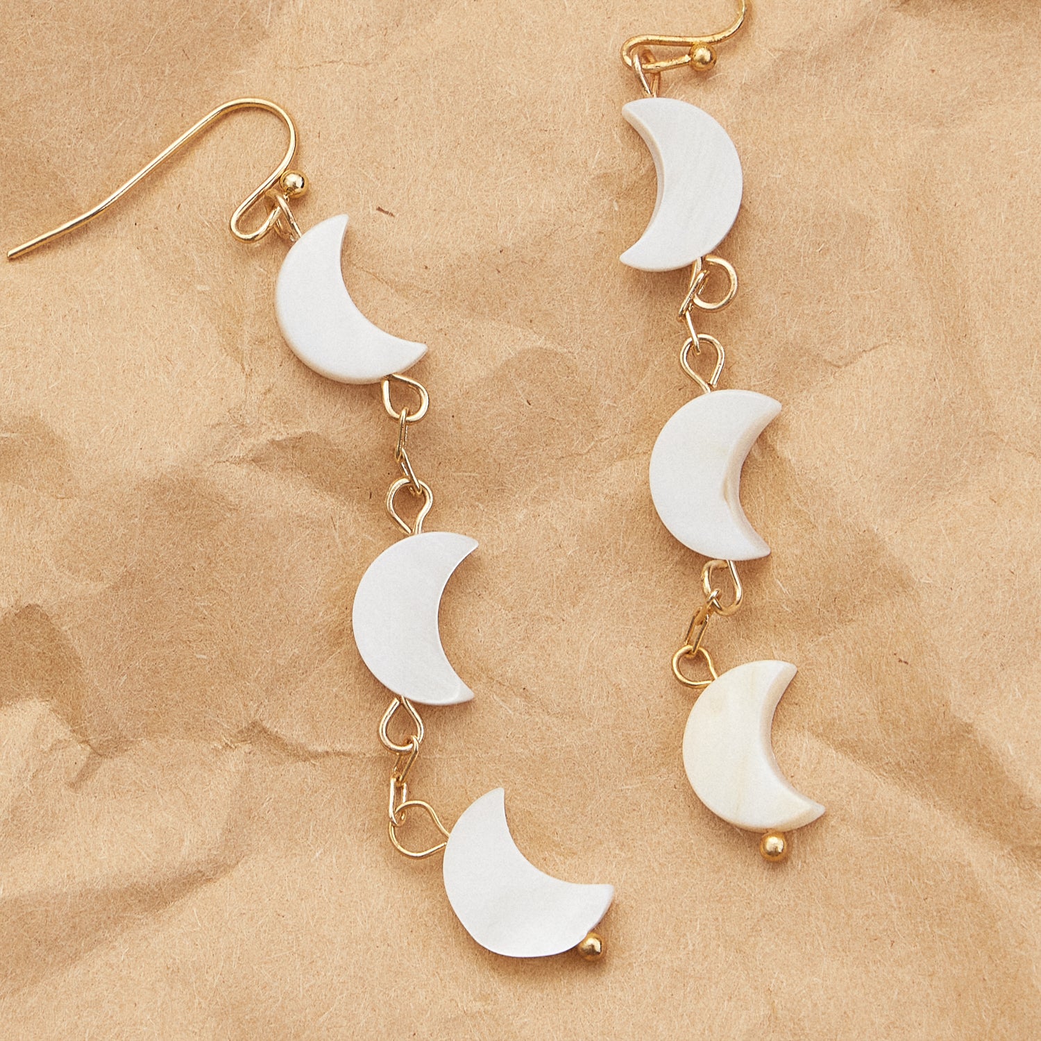 Channel celestial beauty with these gold crescent moon drop earrings, featuring delicate mother of pearl accents. The lightweight design cascades with elegant lunar shapes, making them the perfect statement piece for any occasion. Whether you're stargazing or stepping out for a night on the town, these earrings bring a touch of magic to your look. Ideal as a gift for celestial jewelry lovers or a treat for yourself.