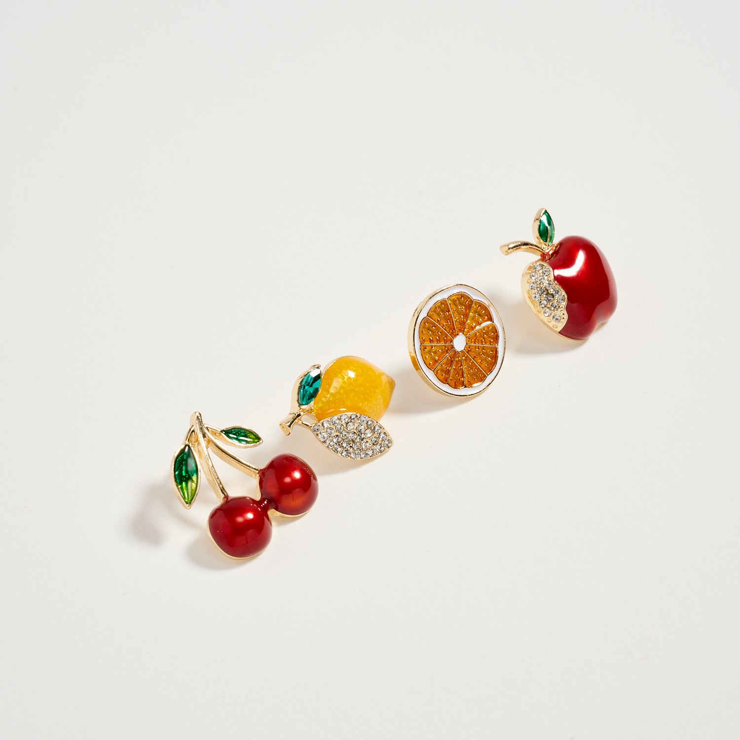 Add a playful pop of color to your look with this vibrant fruit-inspired brooch set. Featuring glossy cherries, a crystal-accent lemon, sparkling orange slice, and red apple design, this 4-piece gold-tone pin collection brings charm and personality to jackets, sweaters, totes, and hats.