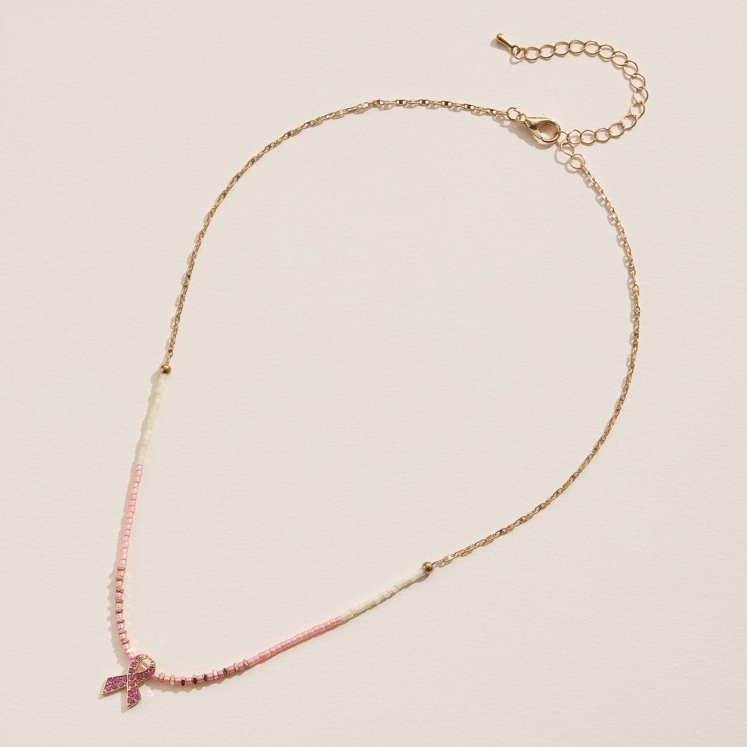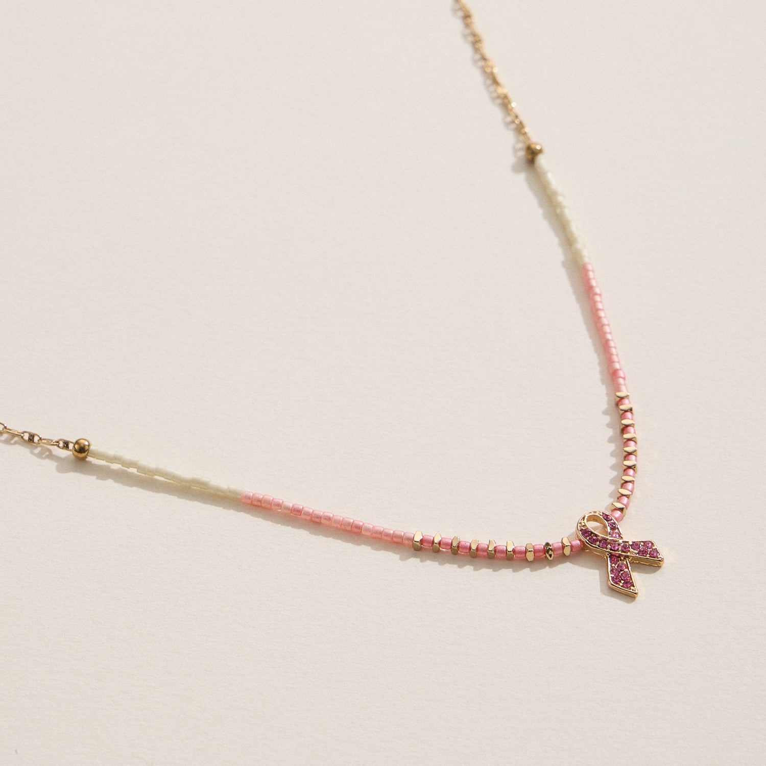 Support and style meet in this pink ribbon beaded necklace. Featuring soft pink and ivory seed beads with a sparkling ribbon charm, this piece is perfect for showing awareness or gifting with purpose. Adjustable gold tone chain for a custom fit. Made with durable base metal and glass beads.