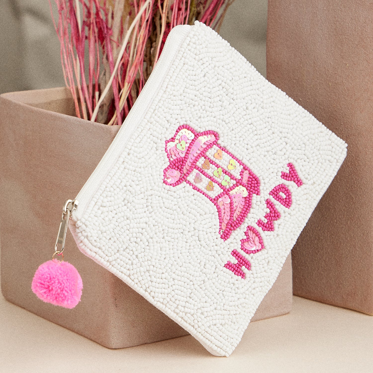 Say "Howdy" in style with this Western-inspired beaded pouch! Featuring a pink cowboy boot and hat design with adorable heart details, this fun and playful clutch is perfect for country lovers, rodeo queens, and anyone embracing their Southern charm. The hand-beaded pattern pops against a crisp white background, and the zip closure with a fluffy pink pompom adds a cute touch. Whether you're hitting up a country concert, a girls' night out, or just showing off your cowgirl spirit, this pouch is a must-have accessory!