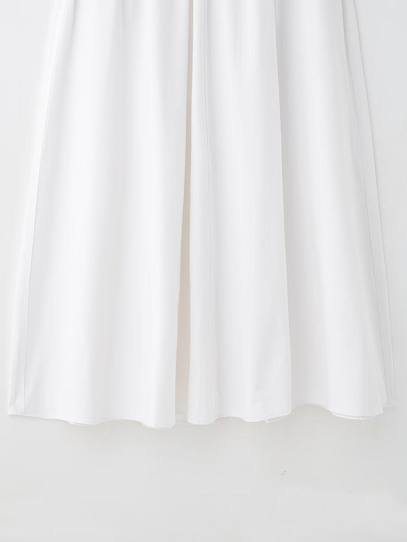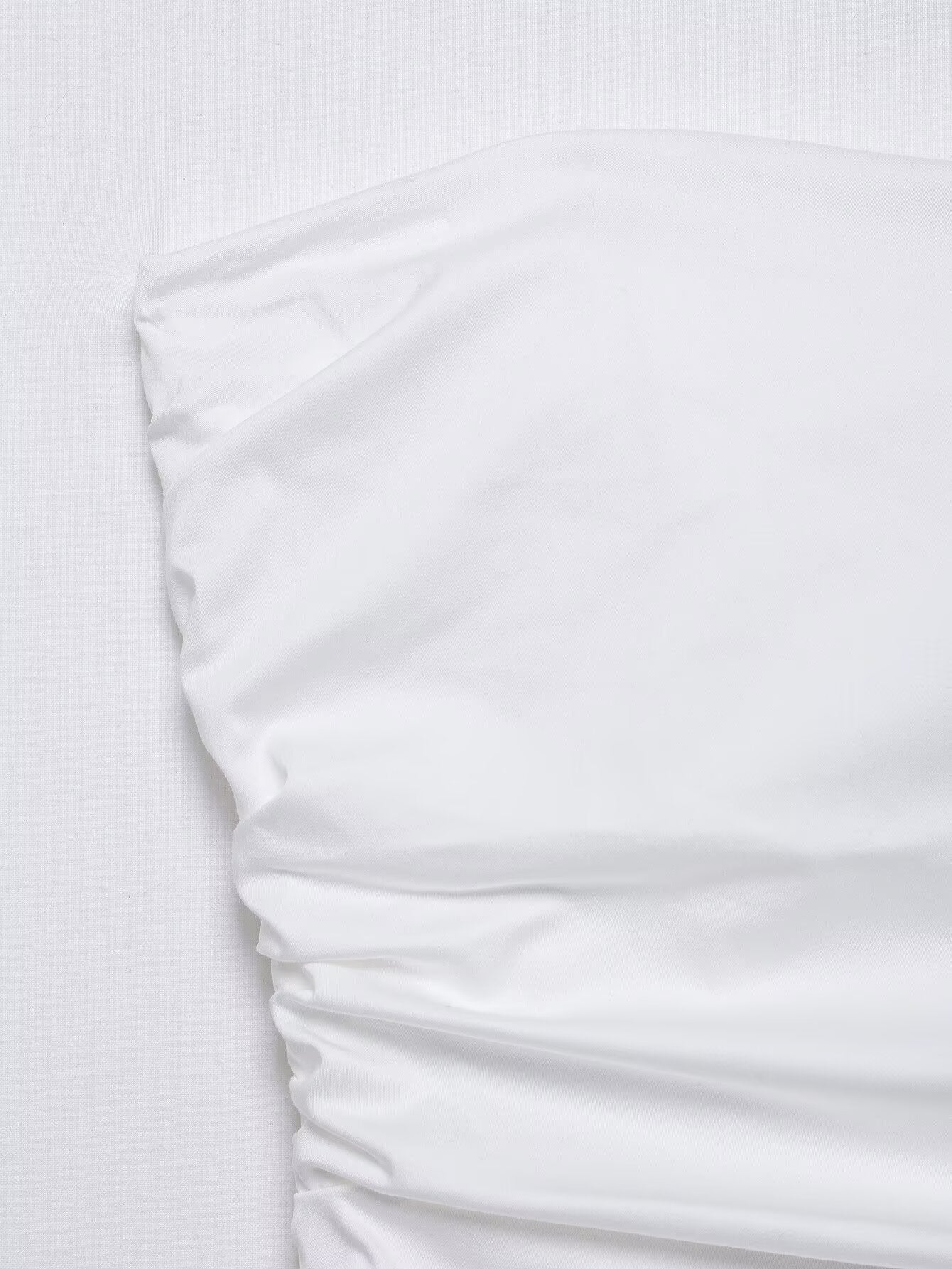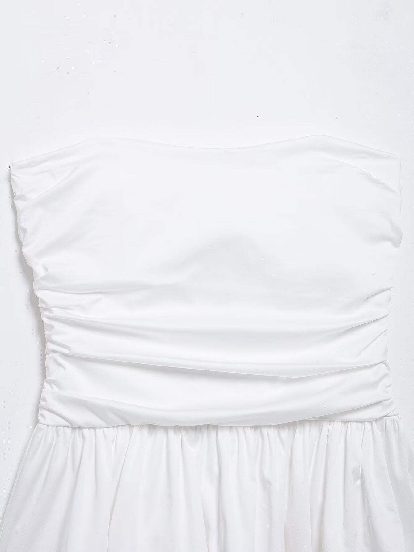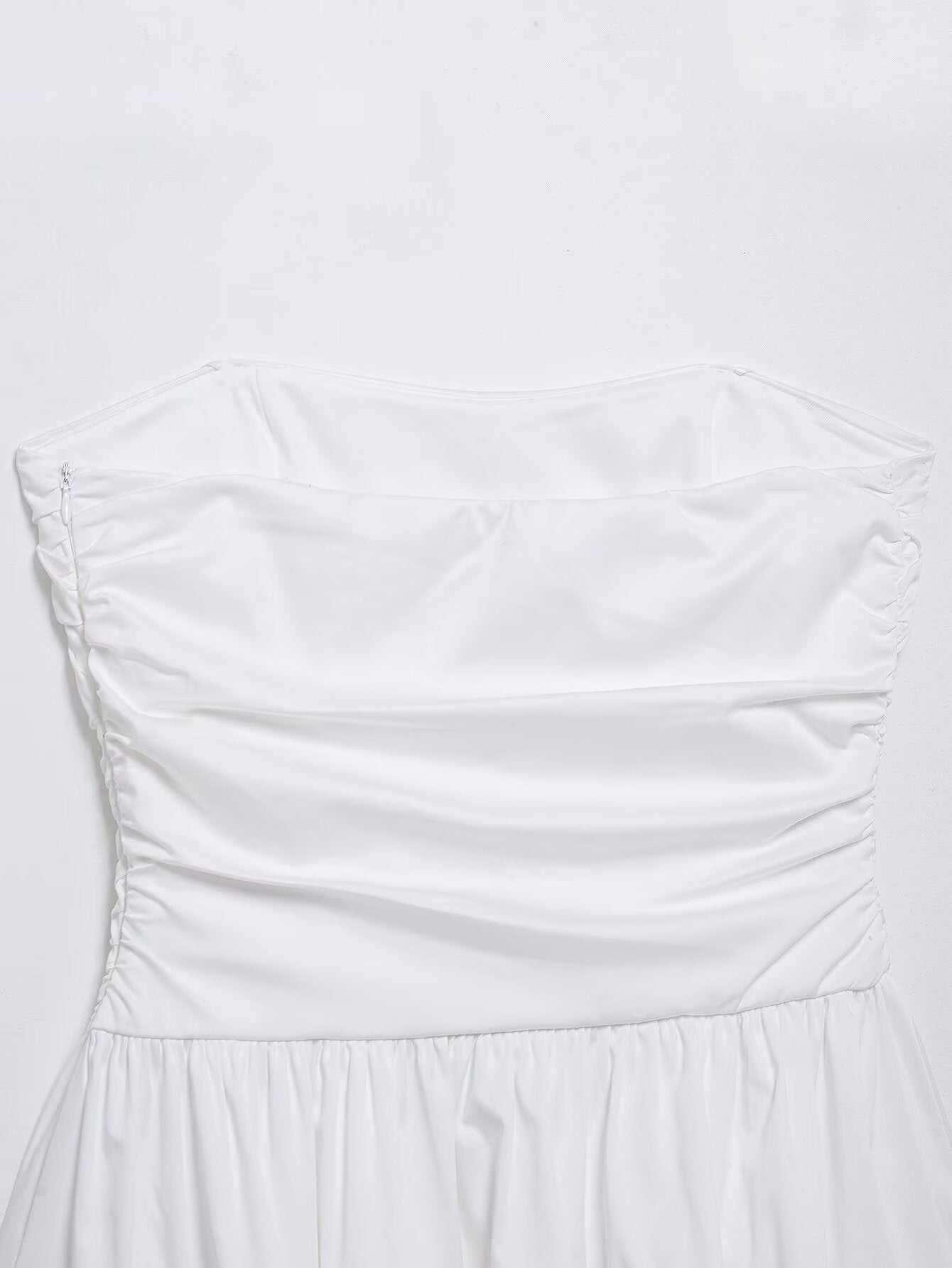 This chic set includes a pleated wavy poplin tube top paired with a high-waist pleated midi skirt. The solid color and elegant design make it suitable for various occasions, from casual outings to more formal events.