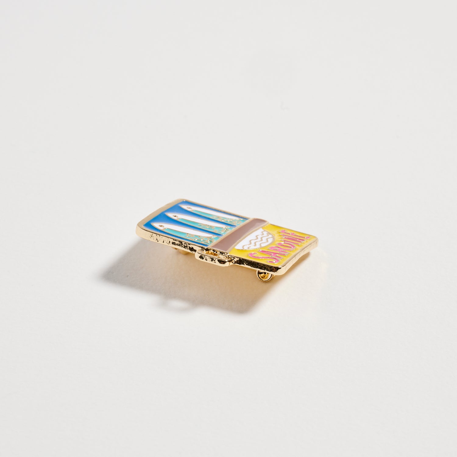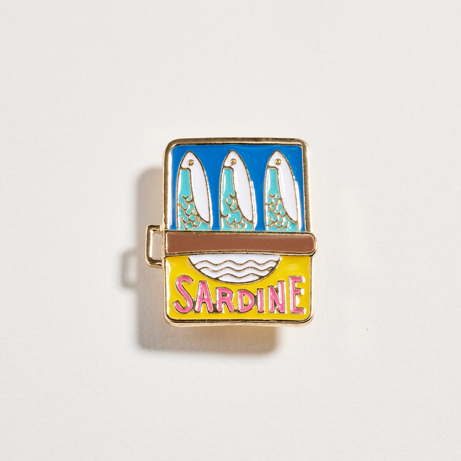 Add a splash of playful charm to your outfit with this colorful sardine can brooch pin. Designed with vibrant enamel detailing and gold-tone trim, this quirky statement accessory brings a fun, artistic touch to jackets, blazers, bags, and scarves.