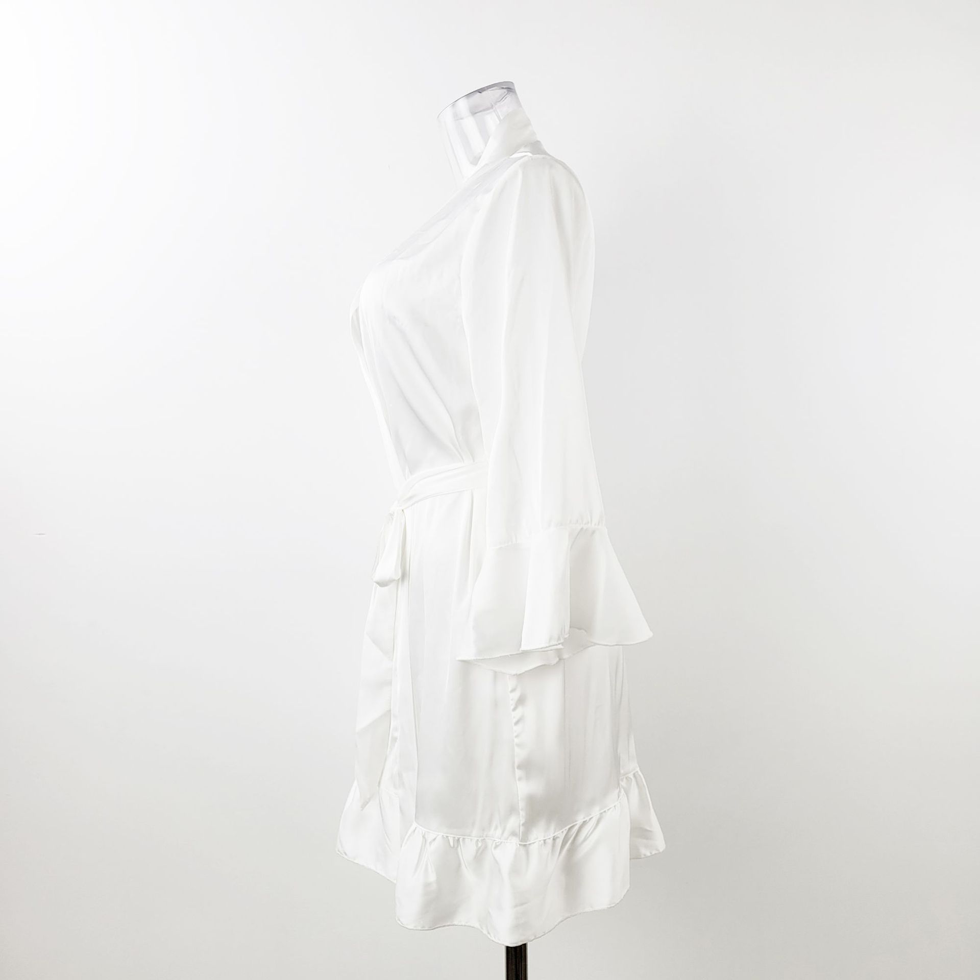 Indulge in luxury with this elegant artificial silk nightgown, featuring delicate lotus leaf cuffs and a flowing silhouette. Designed to provide both comfort and allure, this gown is perfect for enhancing your nighttime wardrobe. The soft, silky fabric caresses the skin, while the open front design allows for easy wear. Ideal for lounging or as a seductive addition to your evening attire.