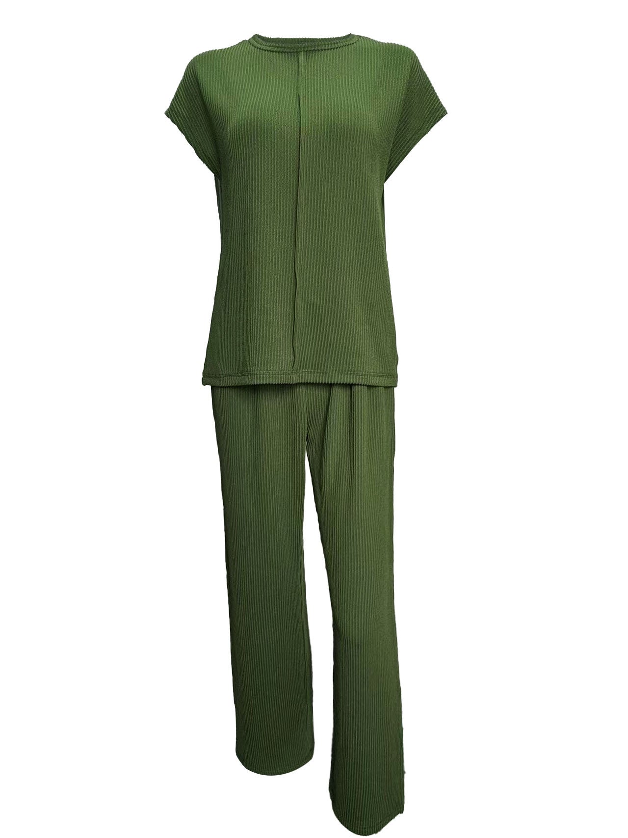 This two-piece set features a 3/4 sleeve shirt paired with matching wide-leg pants, offering a comfortable and stylish look. Crafted from lightweight polyester in a solid color, it's perfect for office wear or casual outings.