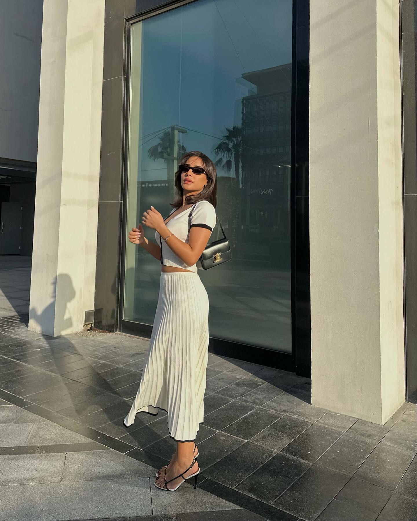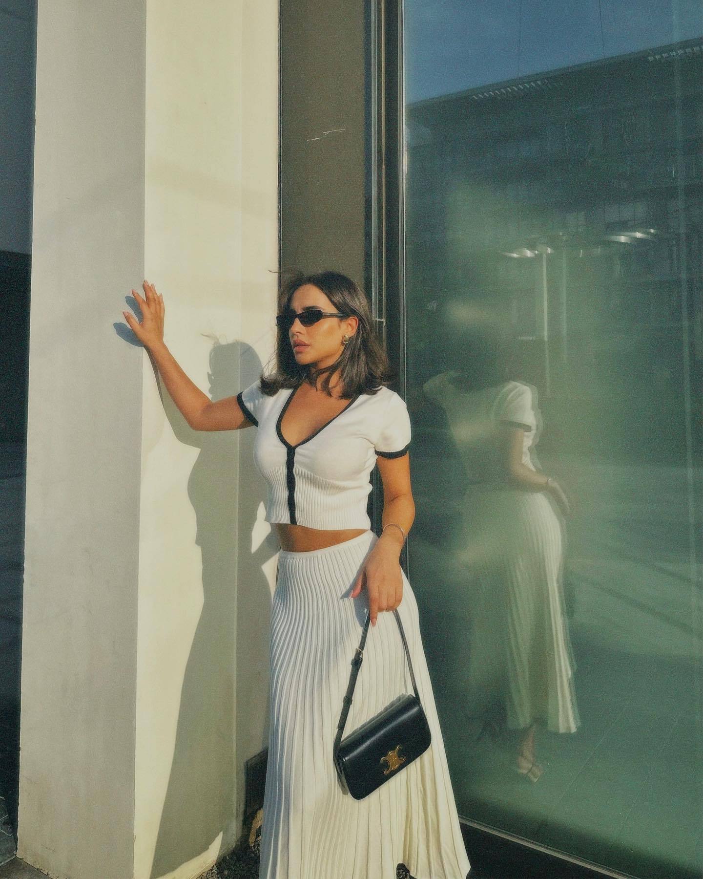 This feminine two-piece set features a cropped cardigan with a collar and front button closure, paired with a matching pleated mini skirt. The soft, lightweight fabric and refined silhouette make it perfect for spring styling, offering retailers an easy-to-sell set with wide seasonal appeal.