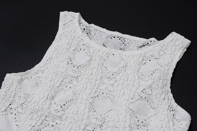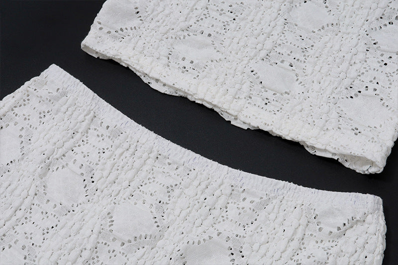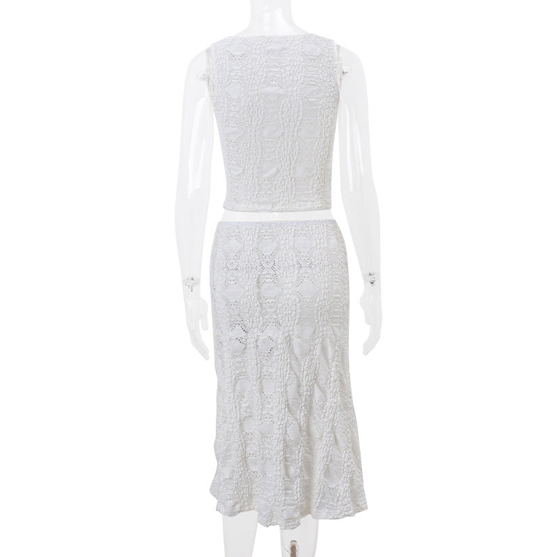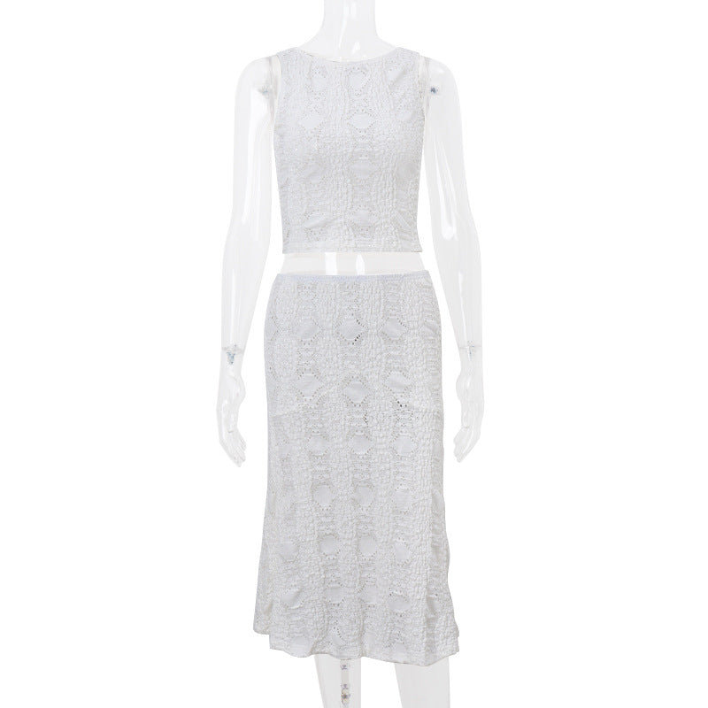 This summer-ready two-piece set features a halter-style cropped top with a keyhole detail and matching drawstring waist pants. The soft jersey fabric and flattering fit make this a go-to look for vacation and lounge edits.