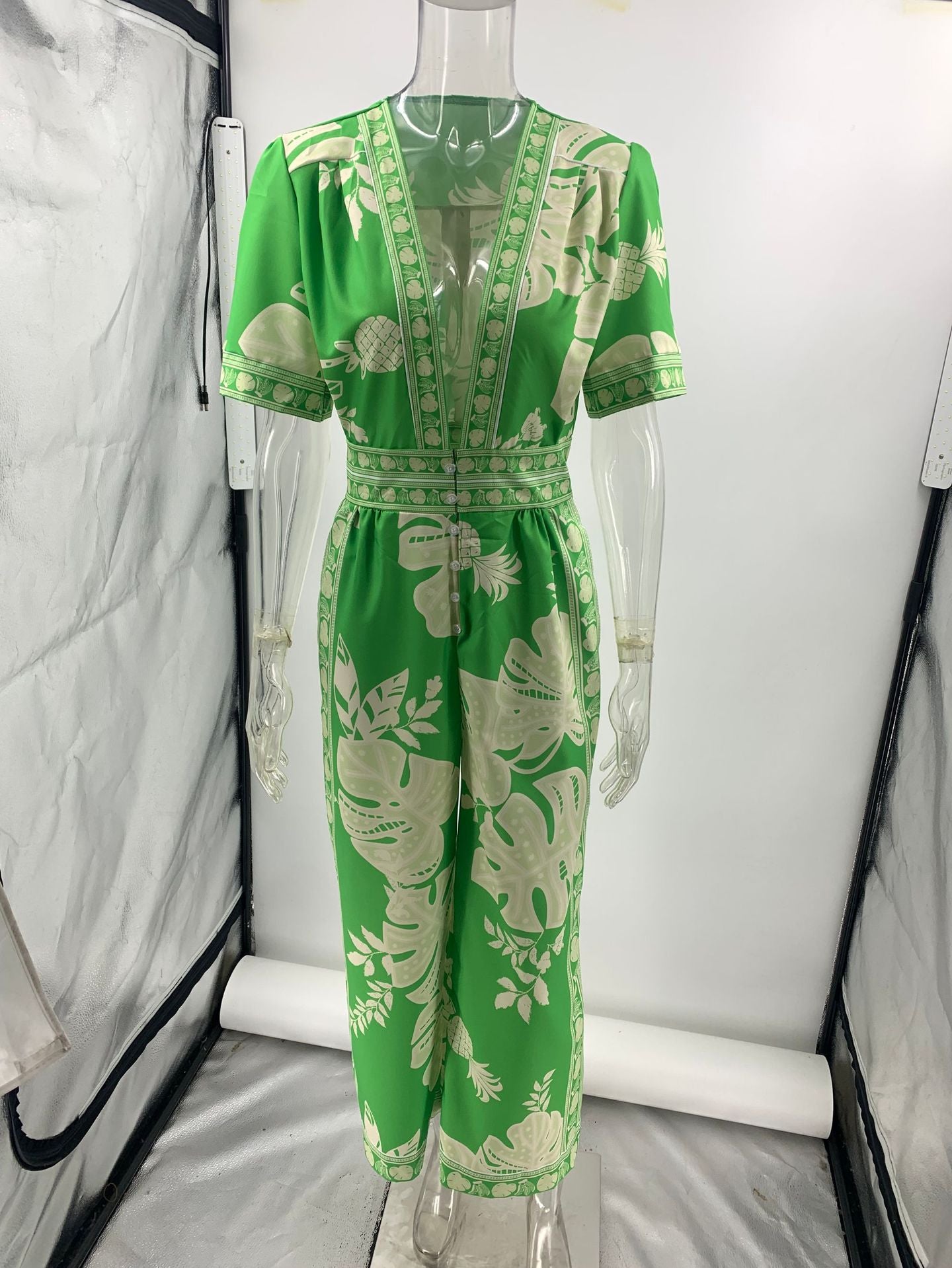 Effortlessly breezy, this printed jumpsuit features a flattering V-neckline, short sleeves, and a relaxed wide-leg fit. Perfect for summer outings, vacations, or casual days when you want to look put-together with minimal effort.