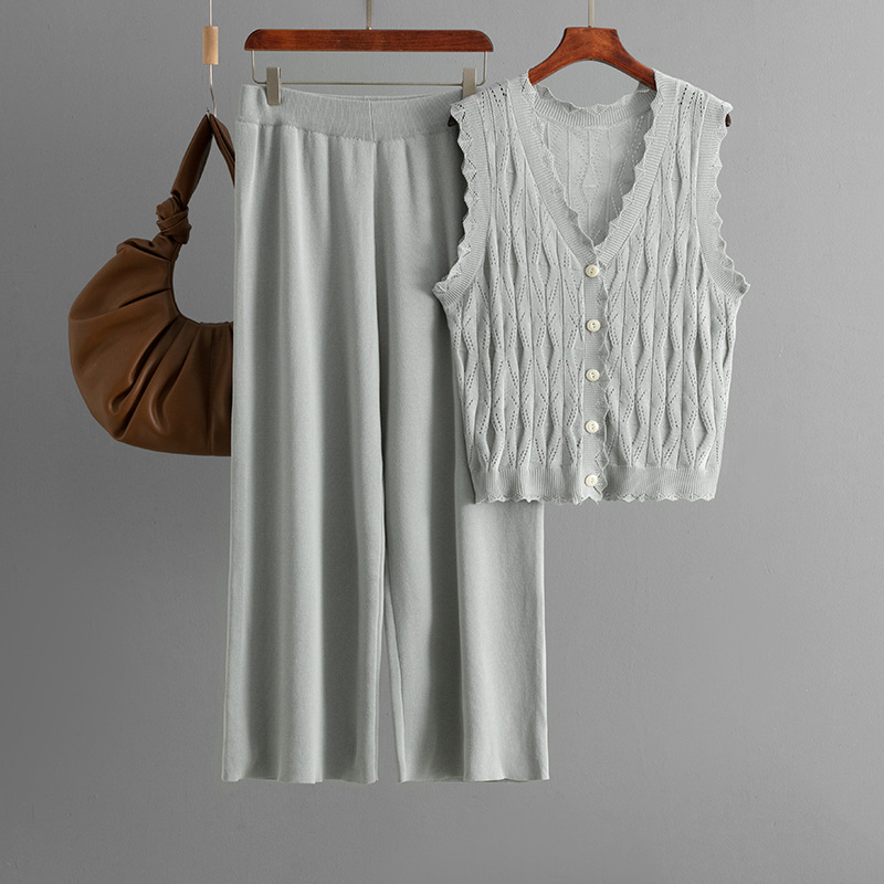 Cozy and coordinated, this three-piece knit set includes a sleeveless vest, a loose open-front cardigan, and straight-leg knit pants. Designed for effortless layering and all-day comfort, it’s perfect for travel, lounging, or creating a soft, elevated casual look.