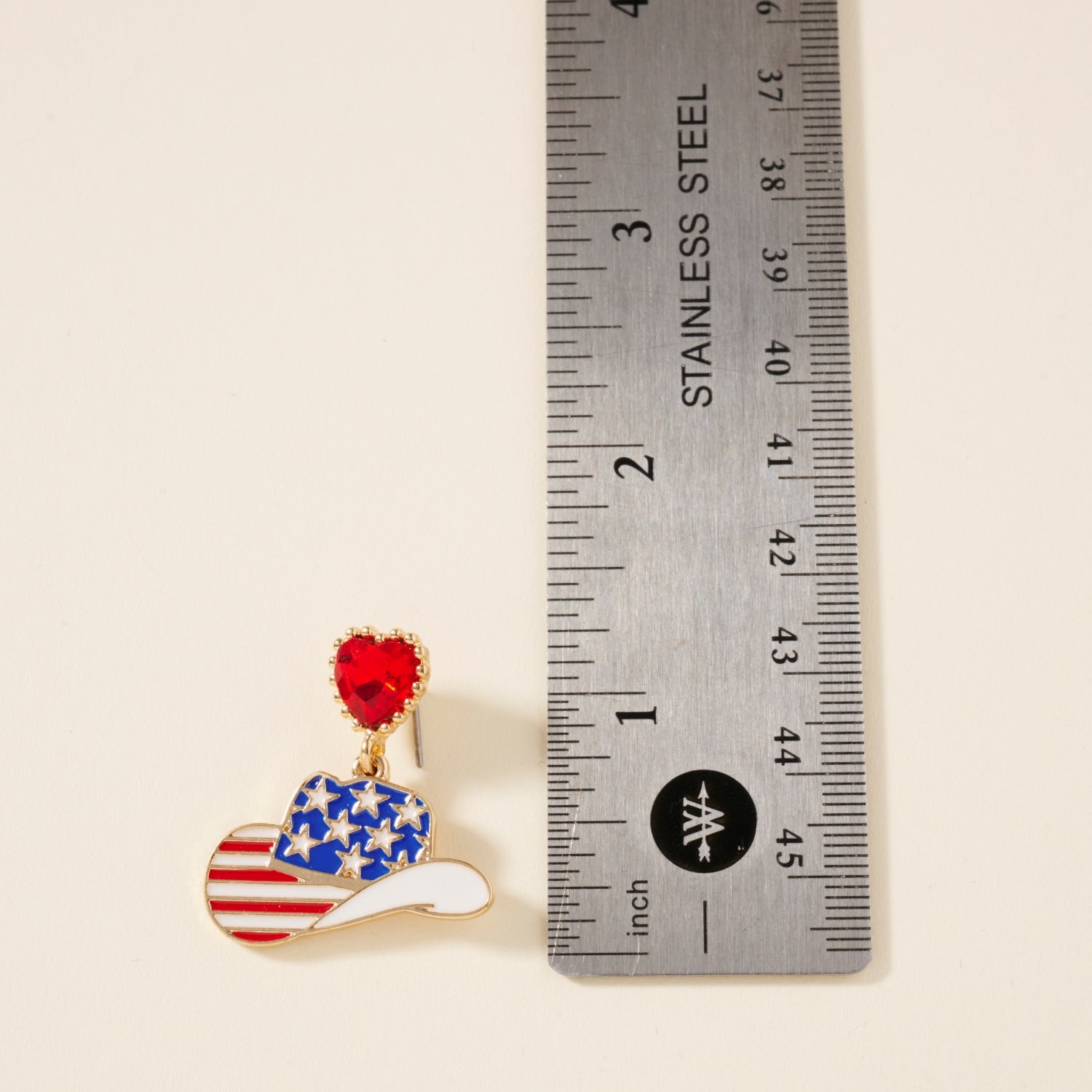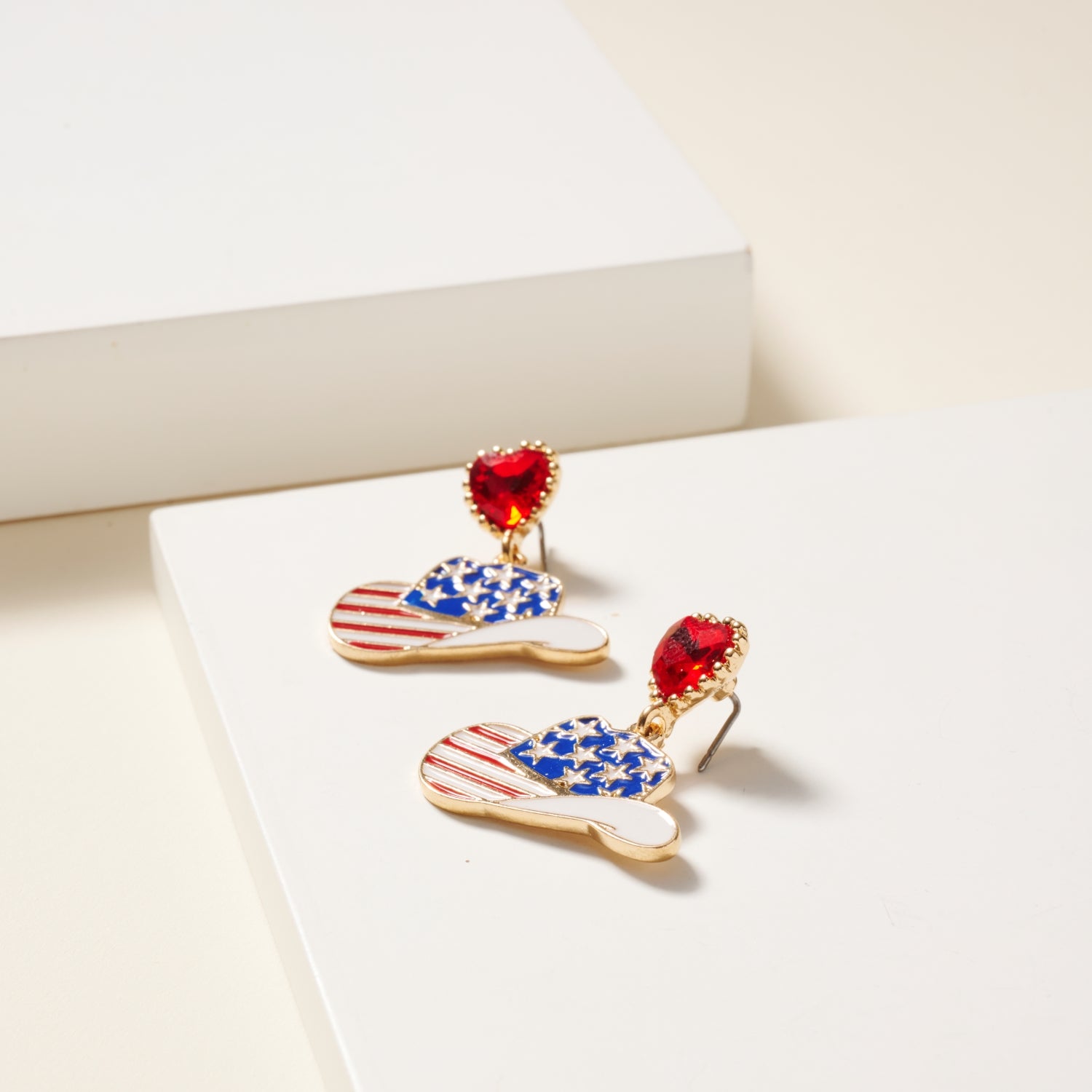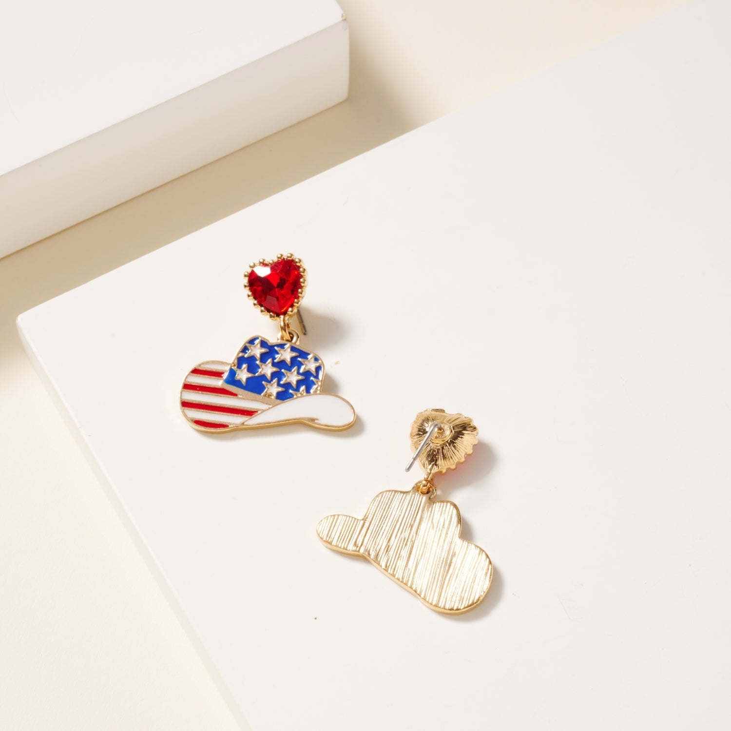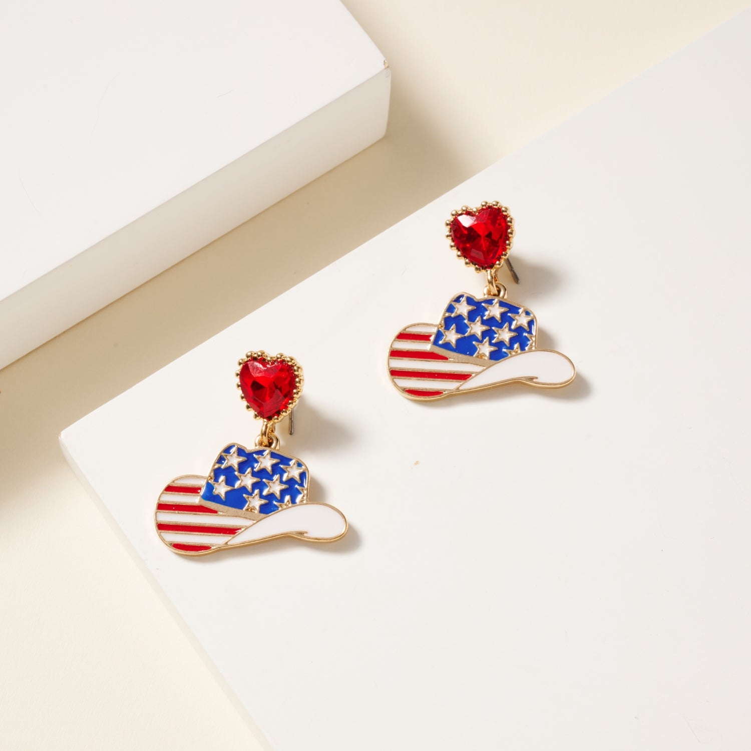 Saddle up with these USA Cowboy Hat Earrings! These quirky and fun earrings are perfect for any cowgirl or cowboy at heart. These dangling earrings feature USA flag pattern and red heart shaped stud detail.