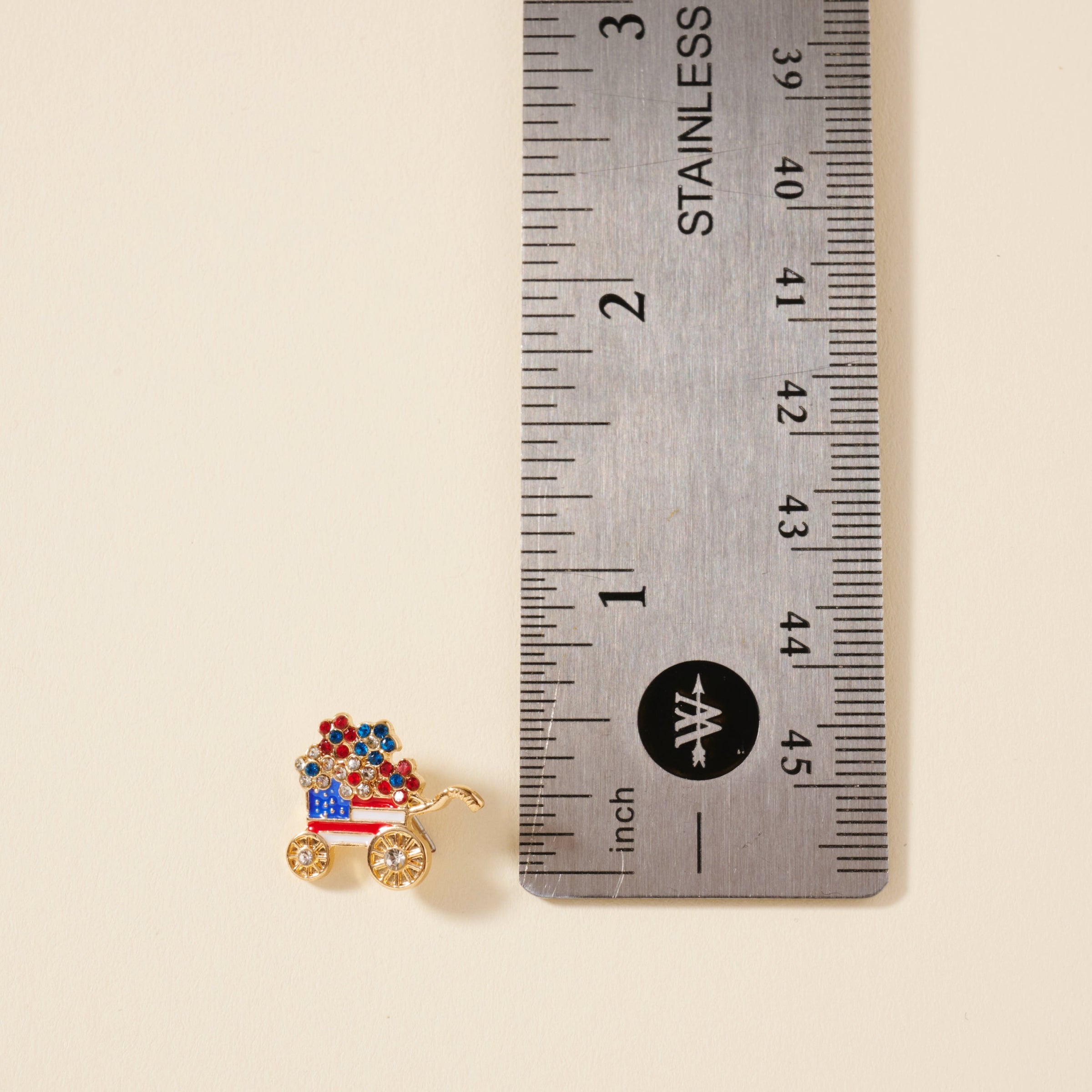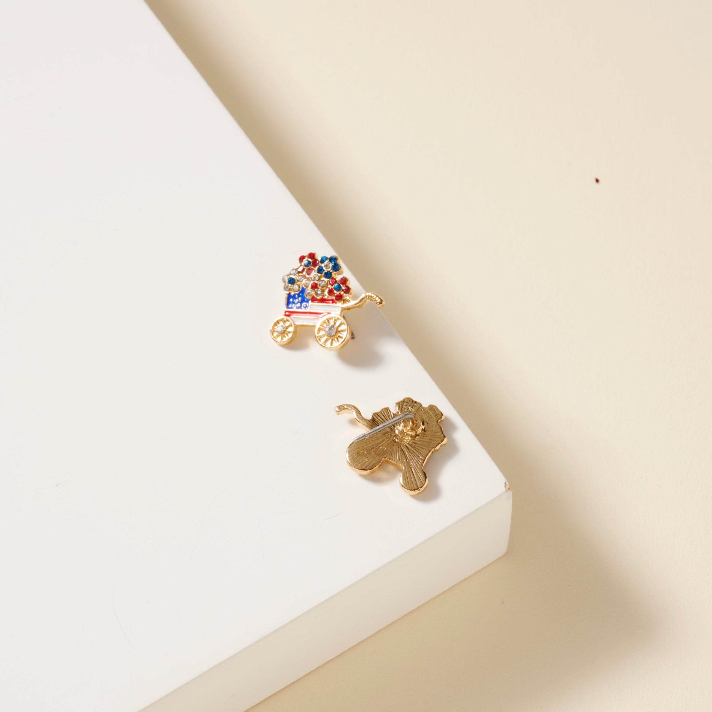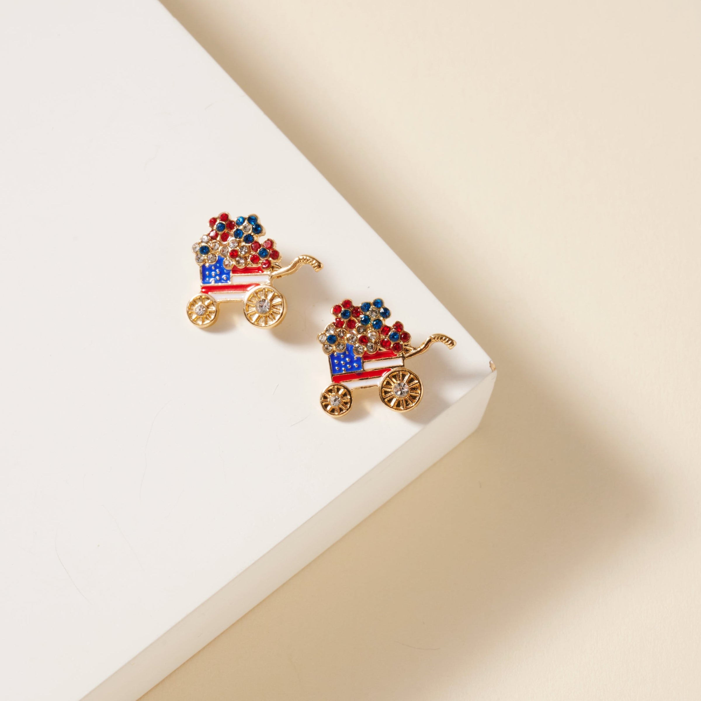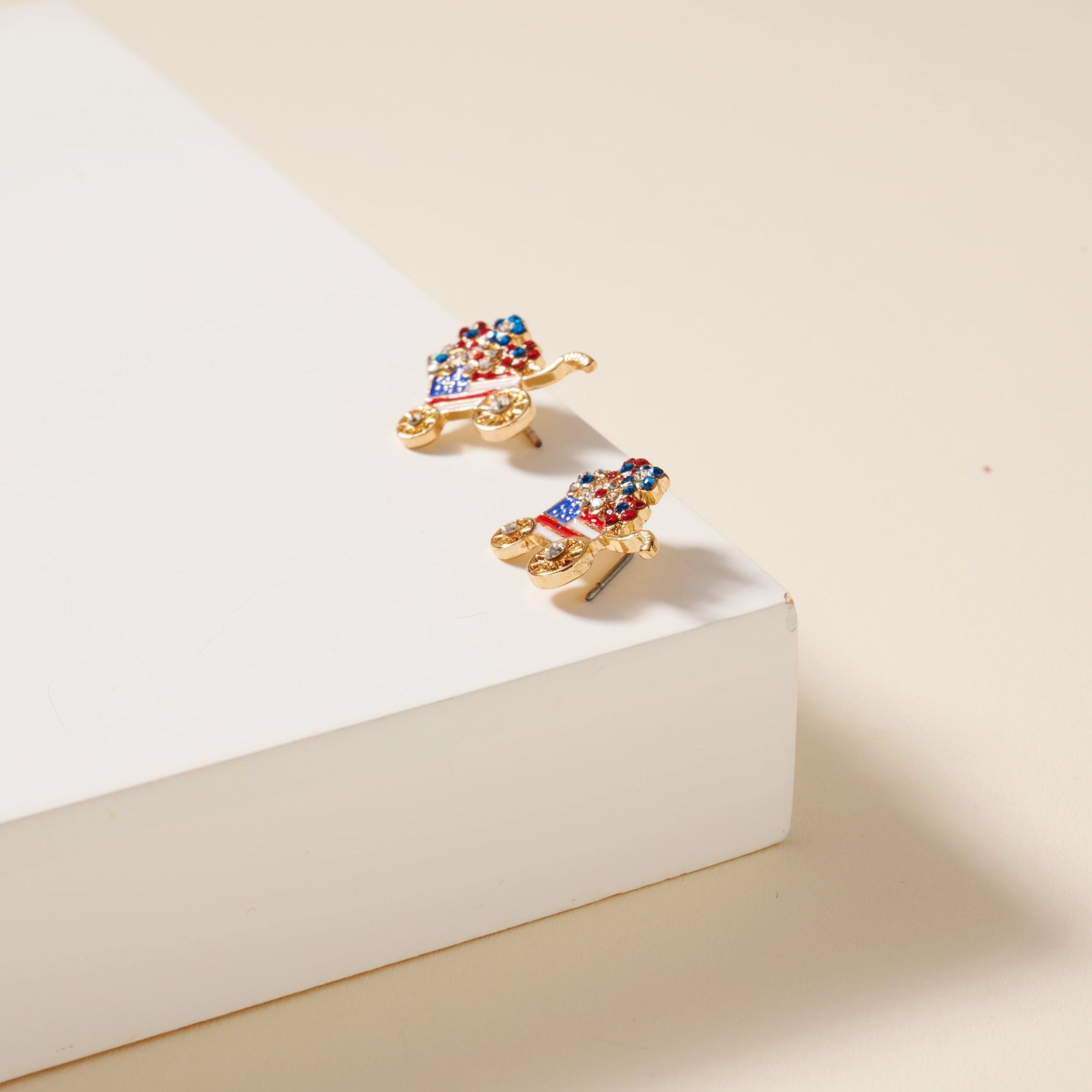 Enamel stud earrings with USA flag pattern and flowers decorated with rhinestones.