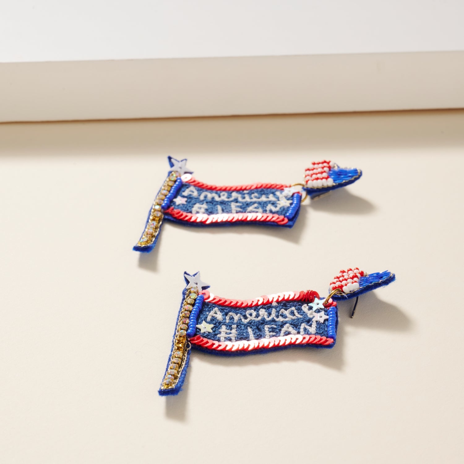 Wave your American pride with these USA Flag Seed Beaded Earrings. These dangling earrings feature flag shape with USA flag patterned seed beads and heart detail with sequins.