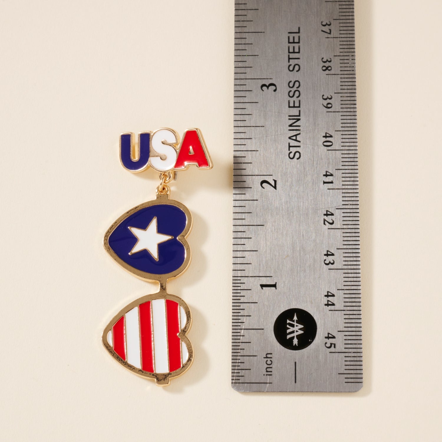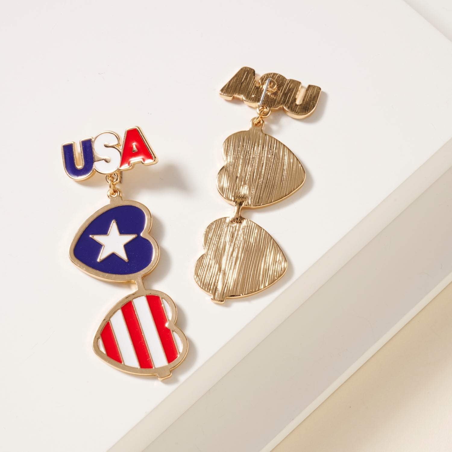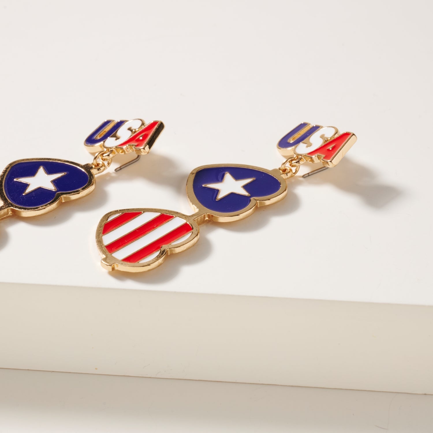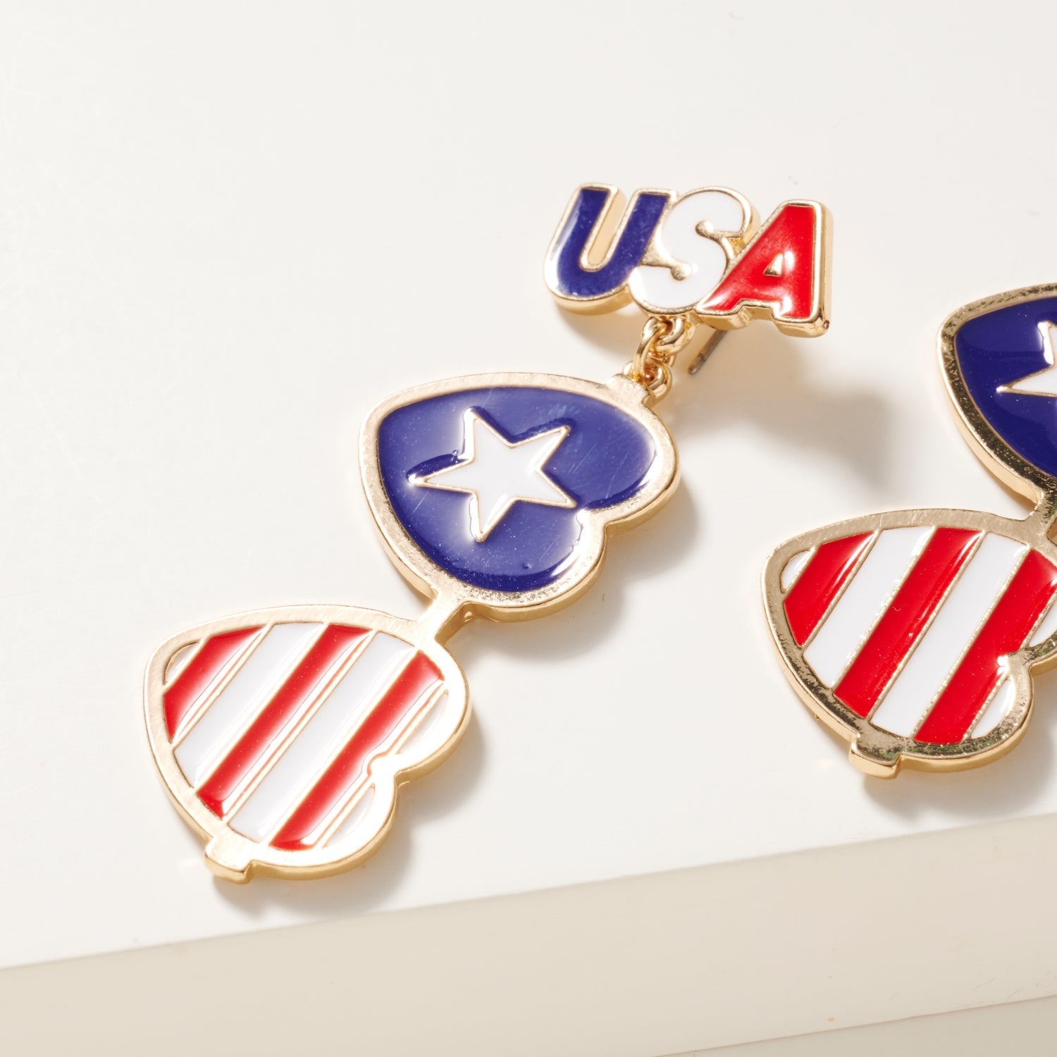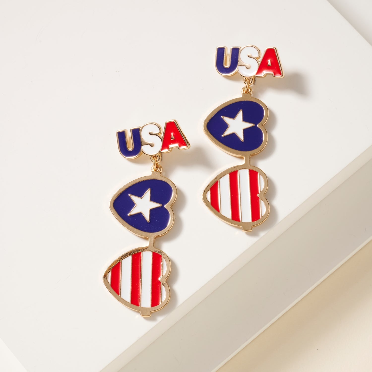 These USA Heart Shape Dangling Earrings are a beautiful addition to any patriotic wardrobe. These enamel earrings feature linked heart charms with USA flag pattern.