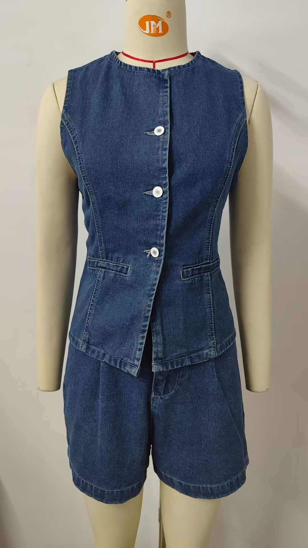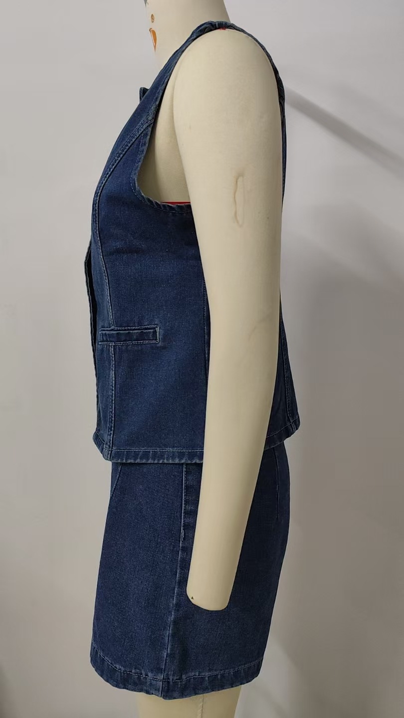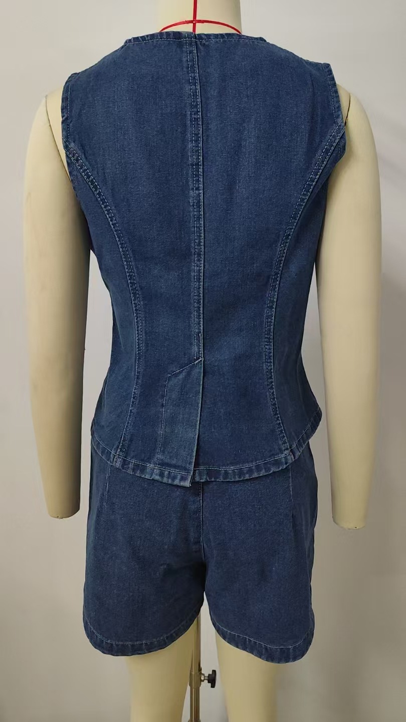 This two-piece denim set features a sleeveless button-front vest and matching washed shorts with split hem and zipper detail. Perfect for casual boutiques looking to stock summer streetwear essentials.