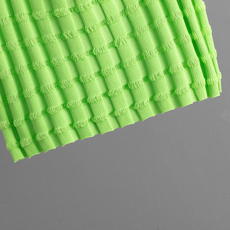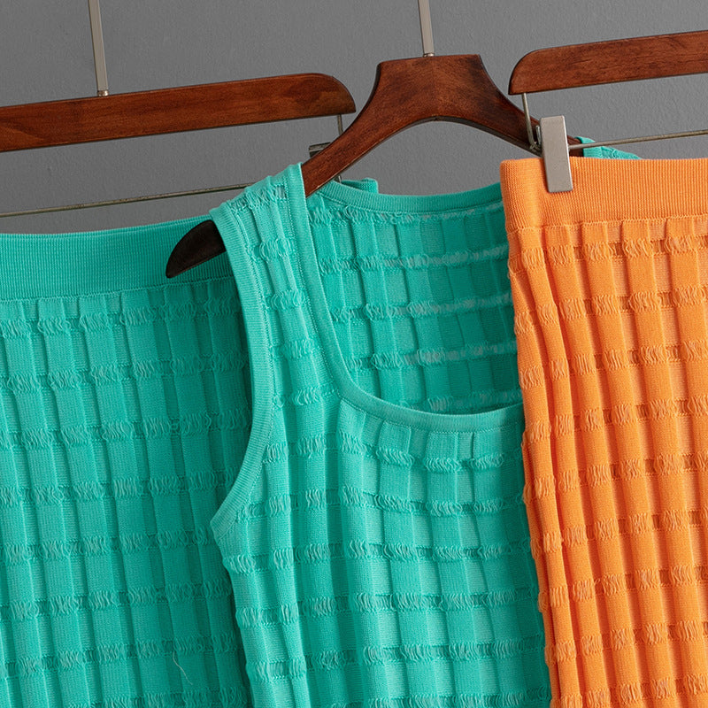This two-piece set includes a sleeveless knit vest and matching skirt. The soft, stretchy fabric offers comfort and a relaxed fit, making it perfect for casual outings or lounging.